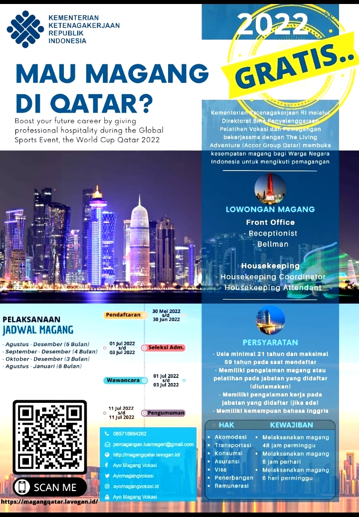 KEMENTERIAN KETENAGAKERJAAN RI MELALUI DIREKTORAT BINA PENYELENGGARAAN PELATIHAN VOKASI DAN PEMAGANGAN BEKERJASAMA DENGAN THE LIVING ADVENTURE  ( ACCOR GROUP QATAR ) MEMBUKA KESEMPATAN MAGANG BAGI WARGA NEGARA INDONESIA UNTUK MENGIKUTI PEMAGANGAN.