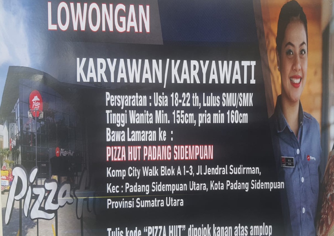 Lowongan Kerja Sebagai Karyawan/Wati PIZZA HUT Cabang Kota Padang Sidempuan.
