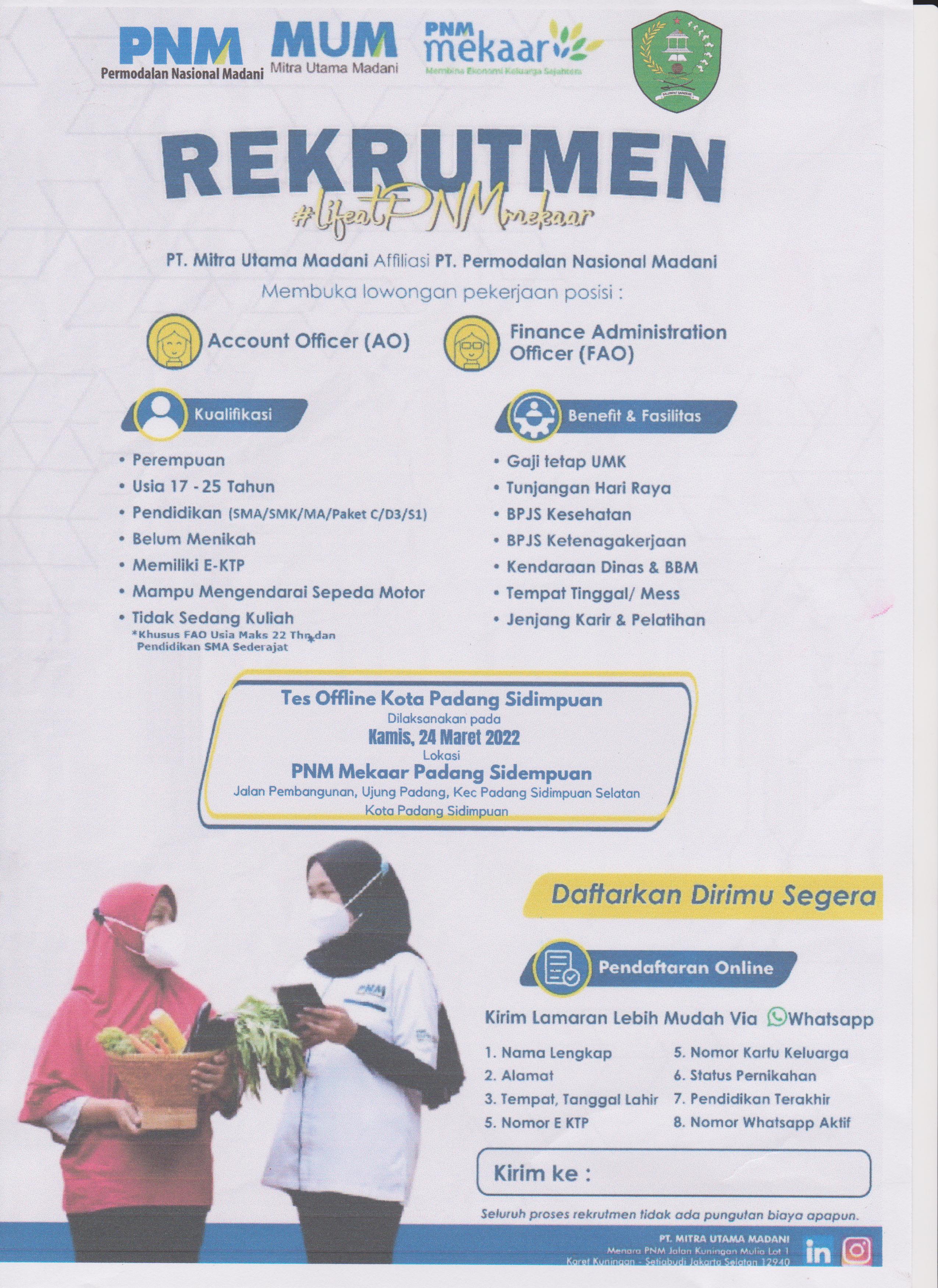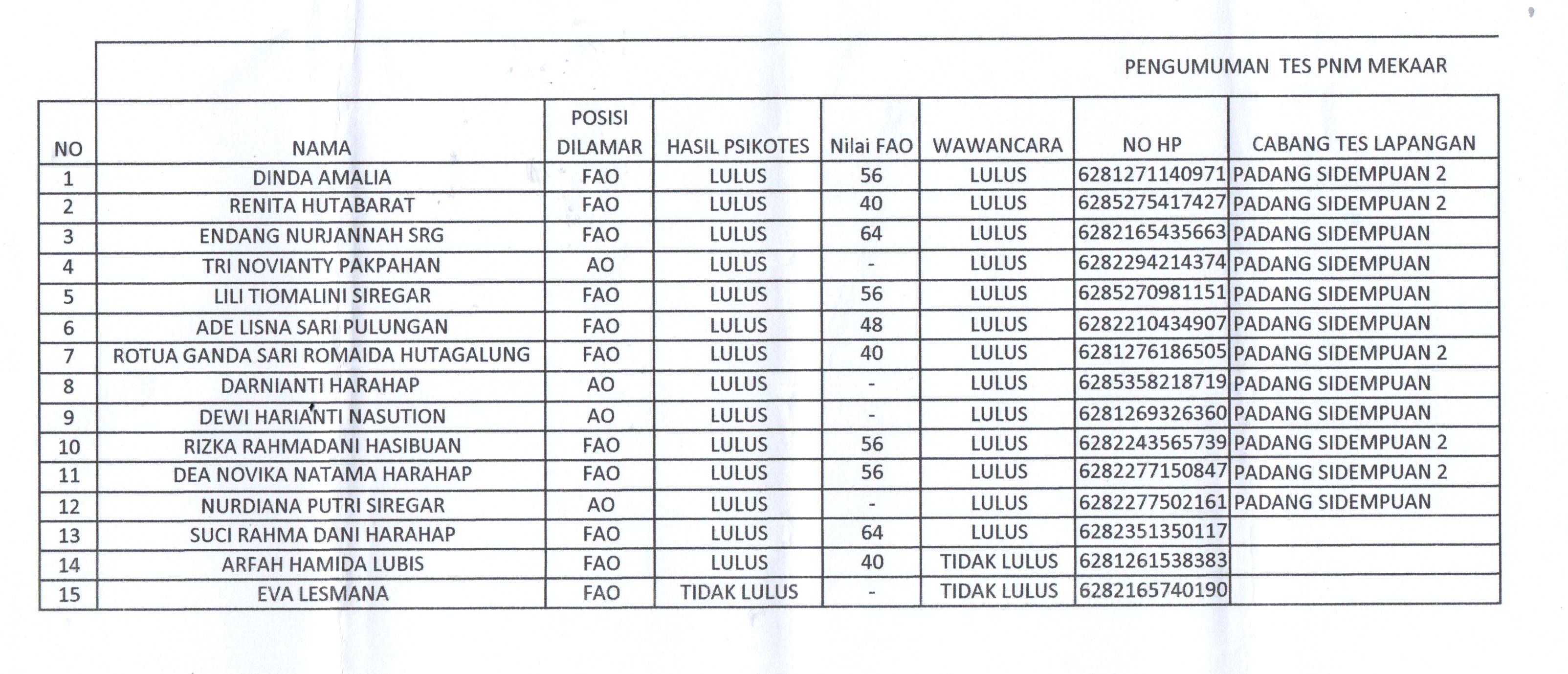 Sehubungan dengan telah dilaksanakannya Test serentak oleh PT. Mitra Utama Madani bekerjasama dengan Dinas Ketenagakerjaan Kota Padangsidimpuan, yang dilaksanakan pada tanggal 24 Maret 2022, maka disampaikan hasil test serentak dari calon lulus kandidat yang melamar.